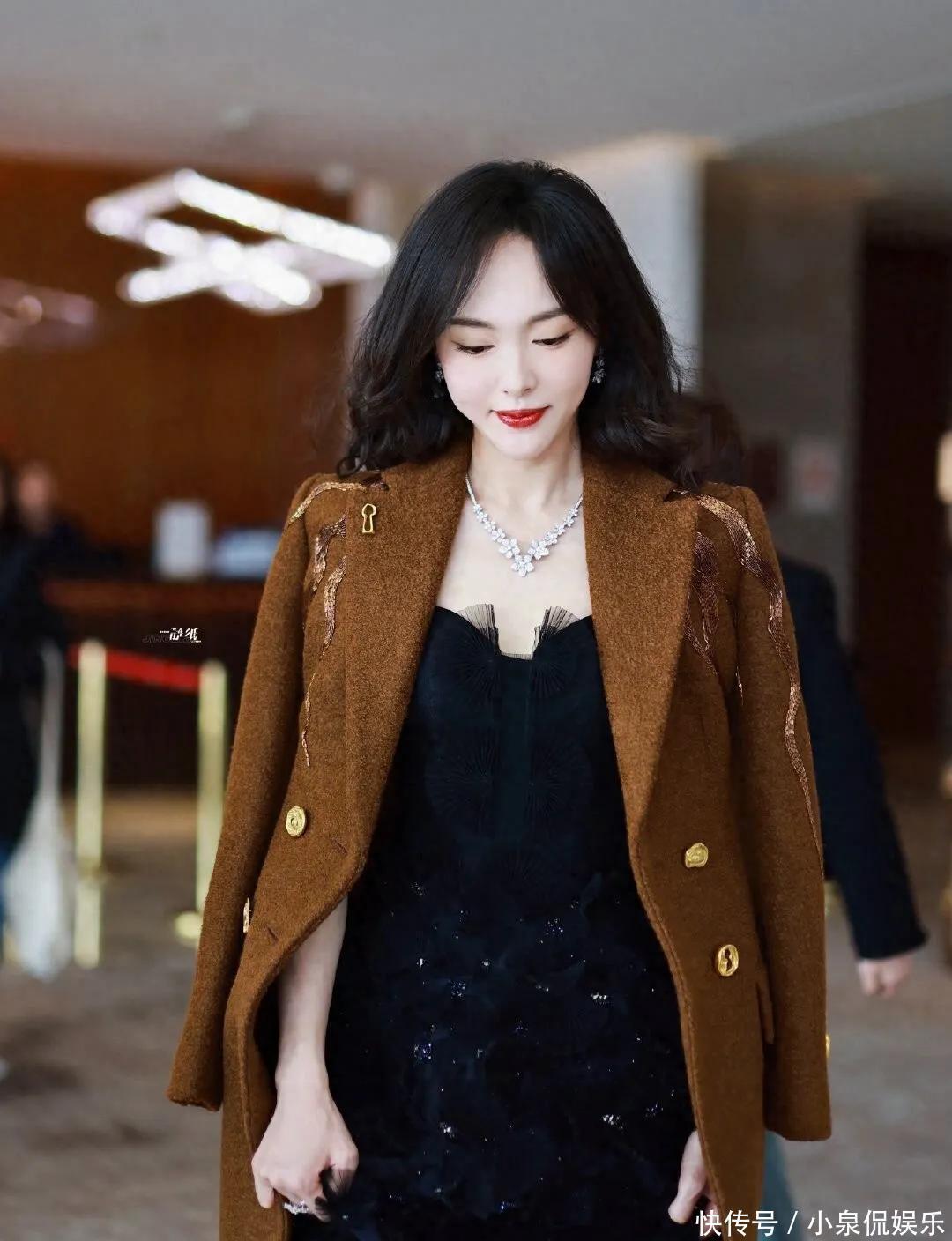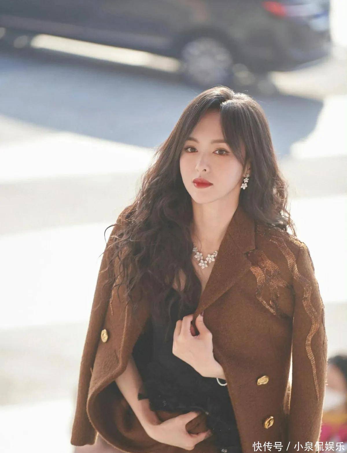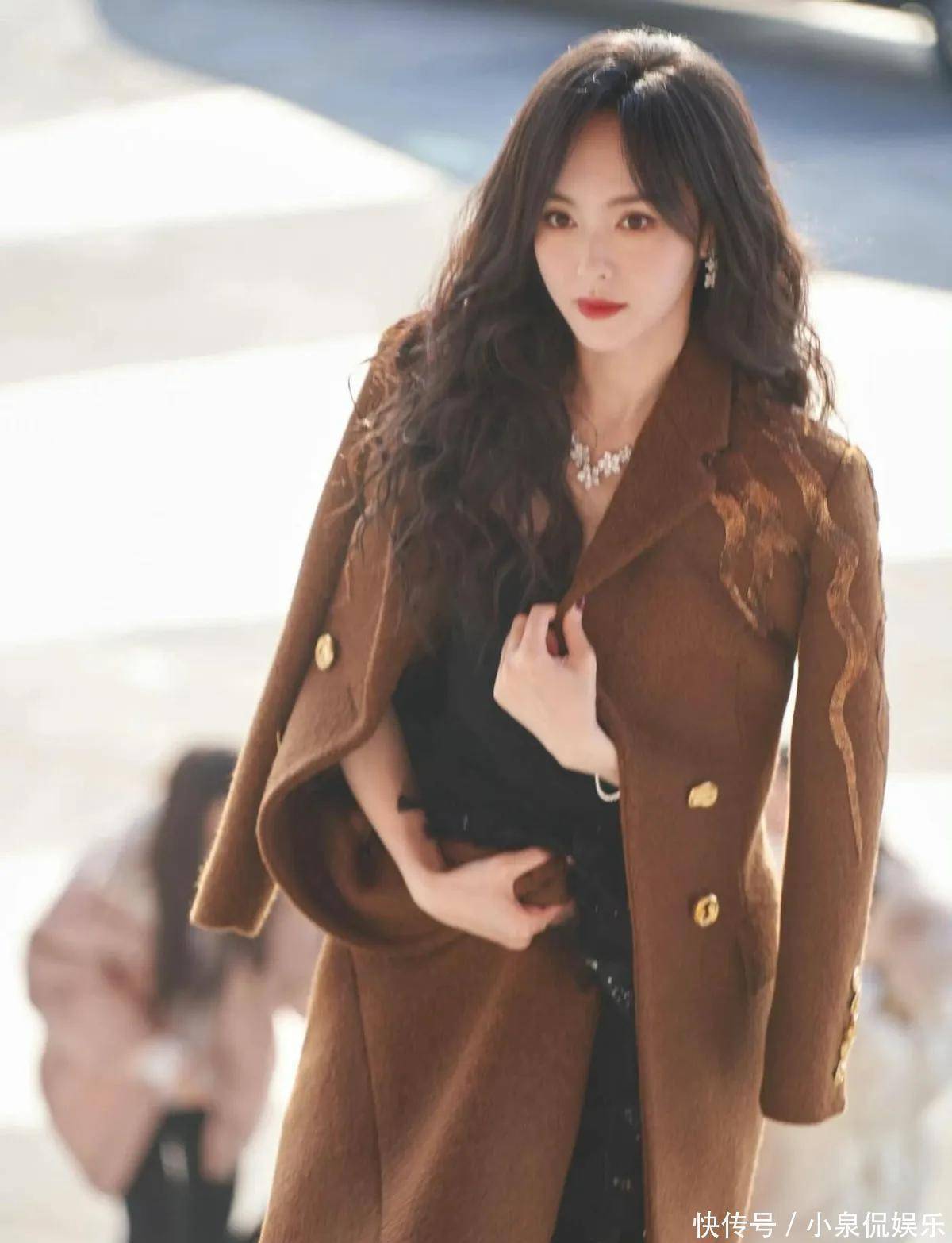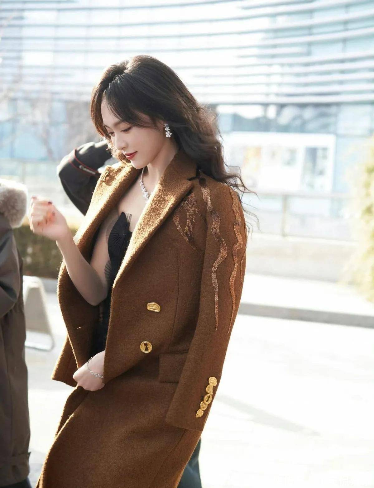 今天刷到唐嫣的照片,真的又被惊艳到了。不是那种浓妆艳抹的美,就是简简单单穿个大衣,头发一披,整个人状态特别好,看着舒服。关键是人家四十多了,脸还是那么自然,一点没僵,真的挺难得。她最近这身焦糖色大衣搭配黑色连衣裙,简直就是秋冬穿搭教科书。大衣是那种厚实的毛呢料子,颜色偏暖,不显老气。衣服上有金色扣子和一些刺绣小细节,看起来就有质感。里面配的是黑色网纱裙,有点透但不暴露,走起路来还带点闪,挺有小心机的。最出彩的是她新烫的大波浪,不是那种死板的卷,是从耳朵下面开始自然散开的弧度,很松很软,风吹起来特别好看。发色是深棕,阳光下一照有光泽,显得皮肤特别白。配上这个发型,整个造型一下子就不单调了。我还注意到她这条裙子长度刚好盖过膝盖,露出一点点小腿,再配上长靴,腿看着又直又细。这种穿法真的很适合冬天,既保暖又显瘦,不像有些人裹得像个粽子。